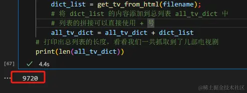 目前,我们通过 get_tv_from_file 函数,已经可以获取单个 html 的电视剧列表,现在我们需要通过一个循环,去处理所有的 html。对于每一个 html 文件,获取字典列表之后,都把列表添加到我们的总列表:all_tv_dict 中。这样,在循环执行结束后,all_tv_dict 变量中就包含了所有电视剧的信息。