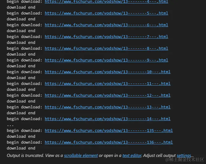 现在第一个网页已经下载成功了。我们目标是下载 137个网页的内容,所以剩余的可以通过一个循环来下载。在我们之前的分析中,下载第二页和之后的内容只需要修改 URL 中的 page 的值即可。