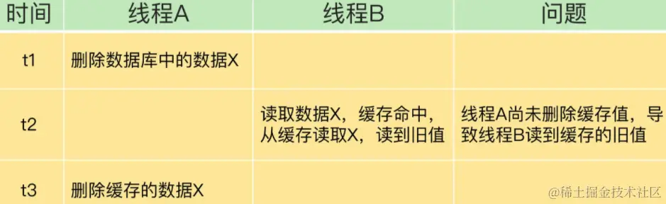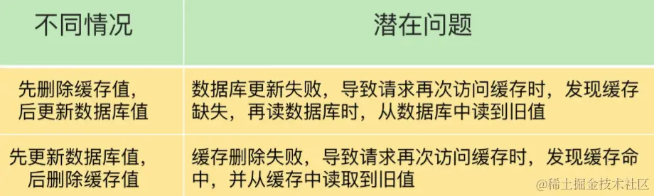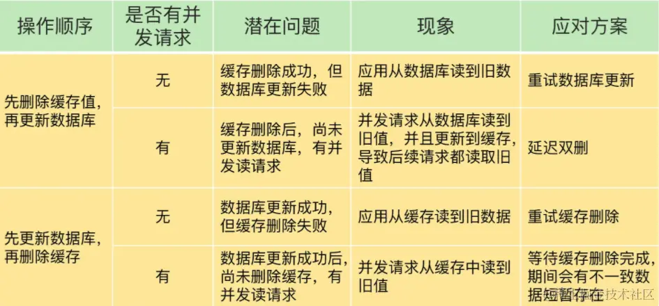 删改数据时,应用既要更新数据库,也要在缓存中删除数据。在更新数据库和删除缓存值的过程中,无论这两个操作的执行顺序谁先谁后,只要有一个操作失败了,就会导致客户端读取到旧值。下面的表总结了刚刚所说的这两种情况。