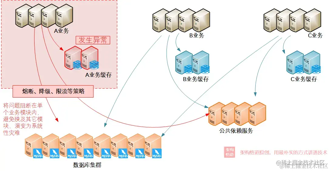 如果某个独立缓存真的出现了缓存雪崩,业务层面应该如何将受损范围控制在仅自身模块、避免殃及数据库以及下游公共服务模块,进而避免业务出现系统性瘫痪呢?这个就需要结合服务治理中的一些手段来综合防范了,比如服务降级、服务熔断、以及接口限流等策略。