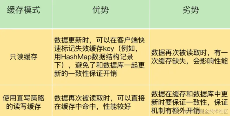 eg:**在商品大促的场景中,商品的库存信息会一直被修改。如果每次修改都需到数据库中处理,就会拖慢整个应用,此时,通常会选择读写缓存的模式。**而在短视频 App 的场景中,虽然视频的属性有很多,但是,一般确定后,修改并不频繁,此时,在数据库中进行修改对缓存影响不大,所以只读缓存模式是一个合适的选择。