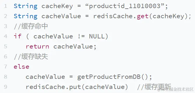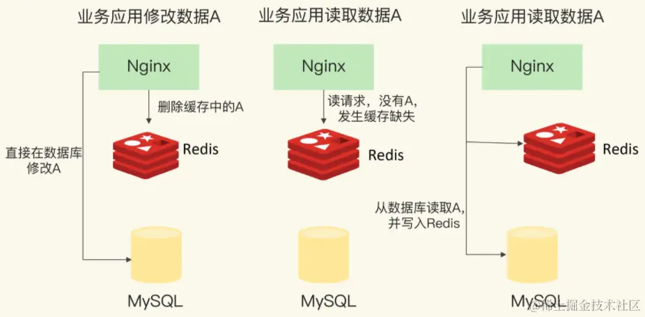 使用 Redis 缓存时,需要在应用程序中增加三方面的代码:当应用程序需要读取数据时,需要在代码中显式调用 Redis 的 GET 操作接口,进行查询;如果缓存缺失了,应用程序需要再和数据库连接,从数据库中读取数据;当缓存中的数据需要更新时,也需要在应用程序中显式地调用 SET 操作接口,把更新的数据写入缓存。