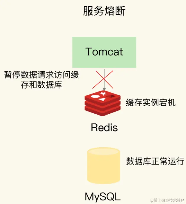所谓的服务熔断,是指在发生缓存雪崩时,为了防止引发连锁的数据库雪崩,甚至是整个系统的崩溃,暂停业务应用对缓存系统的接口访问。再具体点说,就是业务应用调用缓存接口时,缓存客户端并不把请求发给 Redis 缓存实例,而是直接返回,等到 Redis 缓存实例重新恢复服务后,再允许应用请求发送到缓存系统。这样避免了大量请求因缓存缺失,而积压到数据库系统,保证了数据库系统的正常运行。在业务系统运行时,监测 Redis 缓存所在机器和数据库所在机器的负载指标,例如每秒请求数、CPU 利用率、内存利用率等。如果发现 Redis 缓存实例宕机了,而数据库所在机器的负载压力突然增加(例如每秒请求数激增),此时,就发生缓存雪崩了。大量请求被发送到数据库进行处理。可以启动服务熔断机制,暂停业务应用对缓存服务的访问,从而降低对数据库的访问压力,如下图所示: