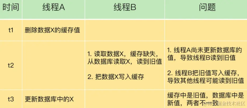 最终 X 的值在缓存中是 1(旧值),在数据库中是 2(新值),发生不一致。