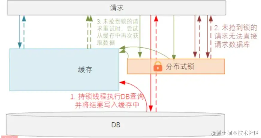 针对这种情况,我们可以为热点数据设置一个过期时间续期的操作,比如每次请求的时候自动将过期时间续期一下。此外,也可以在数据库记录访问的时候借助分布式锁来防止缓存击穿问题的出现。当缓存不可用时,仅持锁的线程负责从数据库中查询数据并写入缓存中,其余请求重试时先尝试从缓存中获取数据,避免所有的并发请求全部同时打到数据库上。如下图所示: