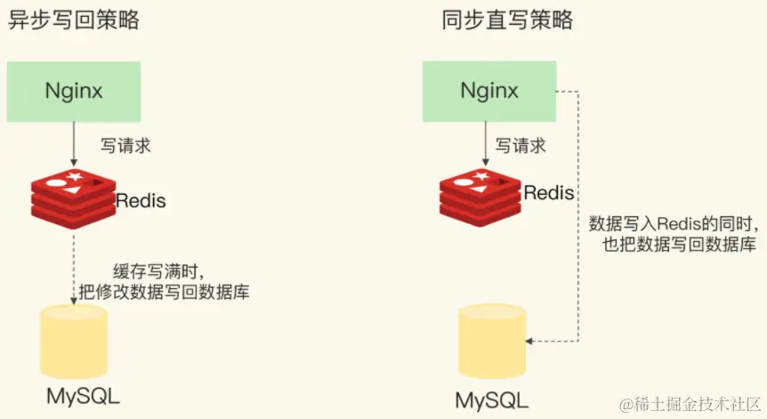 **同步直写策略:**写缓存时,也同步写数据库,缓存和数据库中的数据一致;