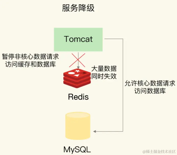 除了微调过期时间,还可以通过服务降级,来应对缓存雪崩。所谓的服务降级,是指发生缓存雪崩时,针对不同的数据采取不同的处理方式。