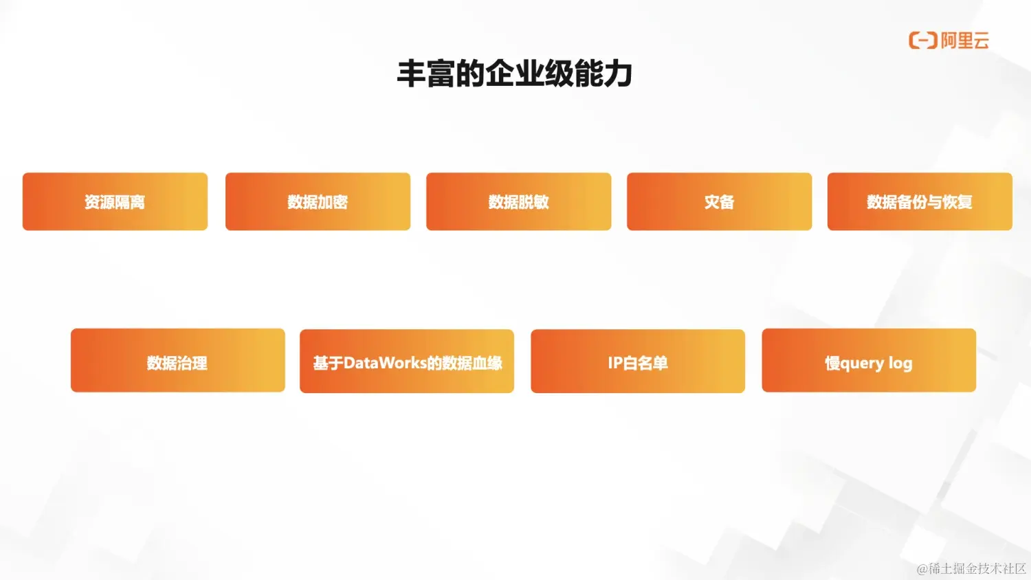 与开源组件不同的是,企业级的实时数仓需要帮助企业快速实现各类资源隔离、数据安全、敏捷运维等能力,让企业能够持续稳定、高效使用数据,保持大数据平台实时在线运行。Hologres 具有资源隔离、数据加密、数据脱敏、灾备,数据备份恢复、IP 白名单、数据治理,数据血缘等丰富的企业级能力。