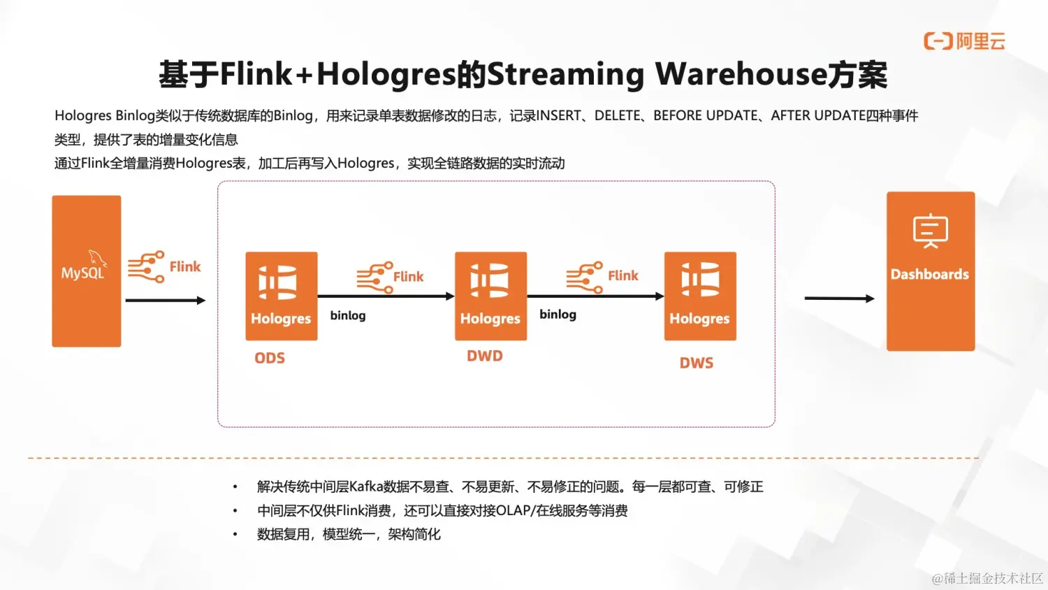 - 行列共存,实现了数据在 Flink 和 Hologres 之间的传输,并使每一层的数据可以被查询和修改。