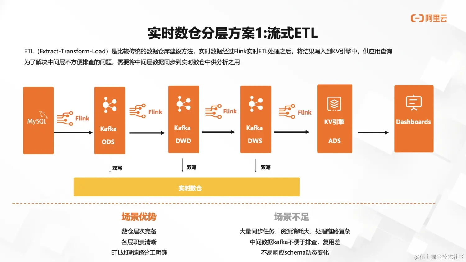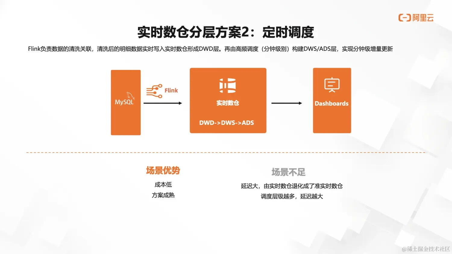 这样的好处是方案成熟简单,成本较低。但它的不足之处就是时效性差。因为 Flink 写进的数据是实时的,但是调度任务其实很难做到很高频调度,因为再往下做调度,比方 5 分钟的调度,实现的技术难度就一下子上去了。而数据量大时,5 分钟可能无法跑完数据,只能增量调度,将会更加计算复杂。所以许多用户在实际使用时候往往选择小时级别调度,实时数仓反而退化成了准实时数仓。