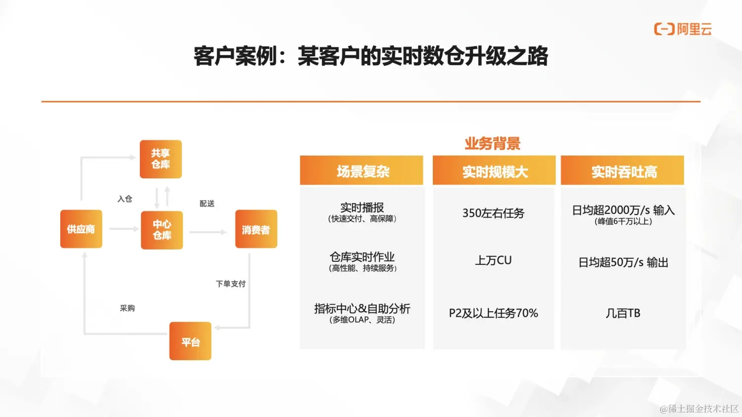 在以上三种业务之下,客户实时数仓大概拥有 350 左右的任务,用上了上万 CU 实时计算规模。同时对一些重要任务标定级,例如 P2 以上的任务,占它们的任务里面可能达到 70% 以上,可以看到实时对他们业务场景来说是非常重要的。其次是业务数据量实时吞吐高,日均流写入量是每秒钟 2000 万条。峰值的时候能到 6000 万条每秒,同时每天会产生每秒 50 万条以上的输出结果,整个数据量大概是在几百 TB。