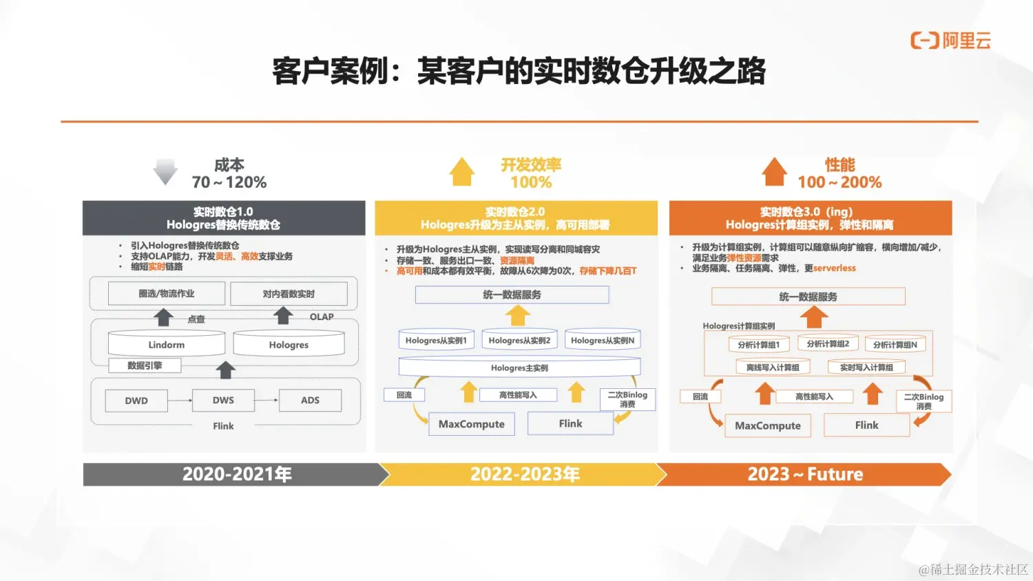可以看到无论是和 Flink 深度集成构建企业级实时数仓,还是与 Paimon 结合在流式湖仓的探索优化,Hologres 在演进过程中始终紧紧围绕实时场景,不断提高实时数仓的性能、可用性、用户体验。未来,Hologres 也会持续通过一站式实时数仓的理念,替换企业纷繁芜杂的数仓架构,让实时数仓更加干净、友好、高效,并帮助企业不断降低成本,加速数字化转型升级。
