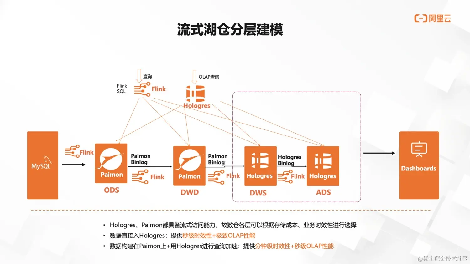 例如针对一些时效性不敏感的 ODS 层数据,数据放在 Paimon 做存储,Hologres 进行查询加速,Hologres 能提供达到分钟级别时效性,相对来说成本更低,而且在和 Paimon 结合的加速查询,我们还在不断持续优化提升性能。