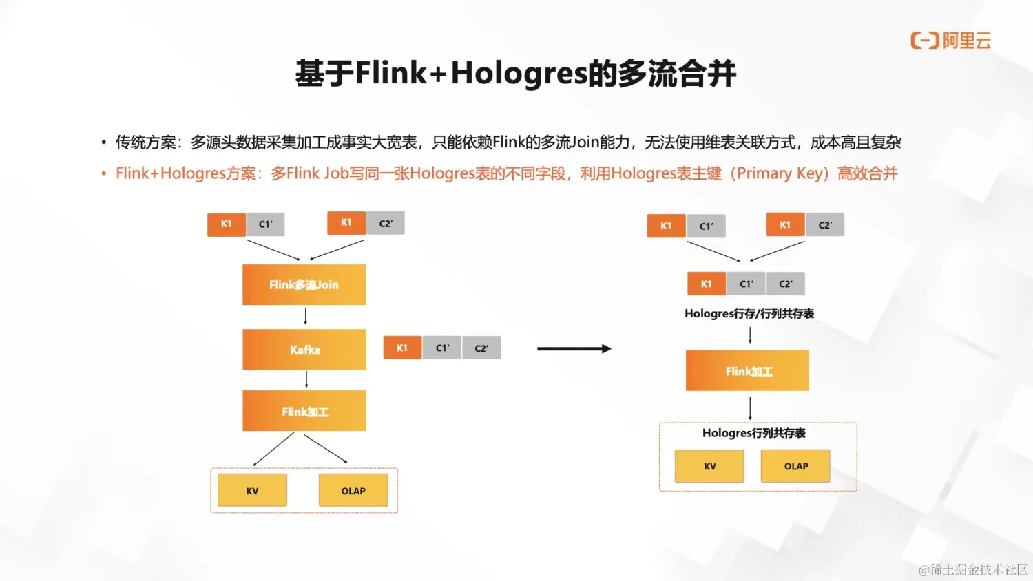 除了刚刚维表 Join 以外,在流计算里面另一个痛点就是双流 Join,如果每一路都要保证完整的状态,从理论上来说,它就是一个成本很高的事情。我们这个方案并不是完全替代双流 Join,而是对于例如用户画像场景,有一个明确的 ID,然后希望基于这一个已有的 ID 去关联若干流的数据。在这种场景下,Hologres 就可以很简单的替代掉双流 Join,来实现一个更低成本的这样一个关联。