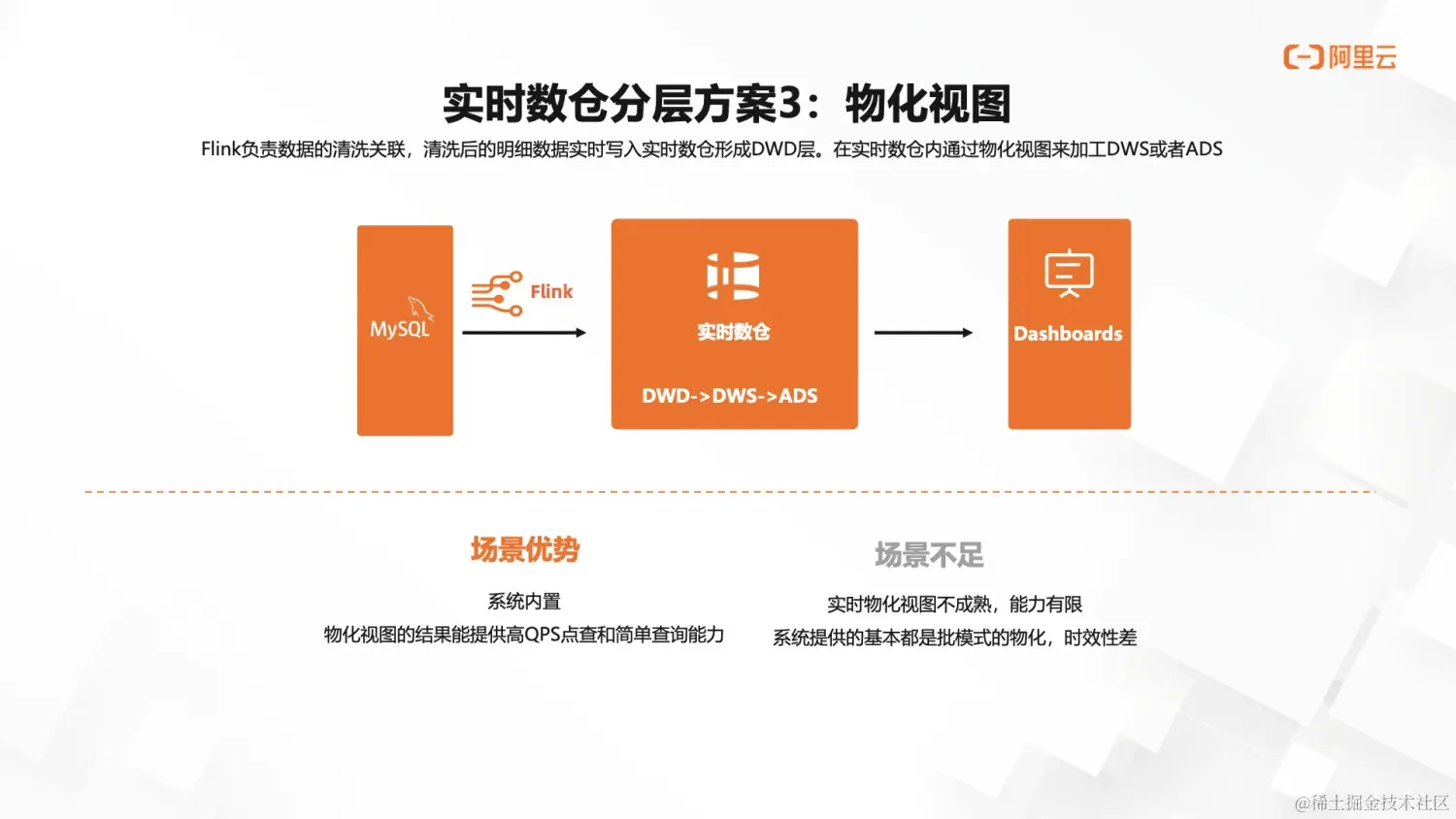 第三种是物化视图的方案。其实本质上来说是前面两个方案的一个结合,Flink 负责数据的清洗关联,清洗后的明细数据实时写入实时数仓形成 DWD 层。在实时数仓内通过物化视图来加工 DWS 或者 ADS。现在大家各自提供的产品能力,基本都以批量物化方式运行,本质上是将调度任务内置化。Hologres 现在也在做实时的物化,在集团内已经在使用了,后续会开放到公共云,但这种实时物化视图对于技术的挑战还是比较较大的。
