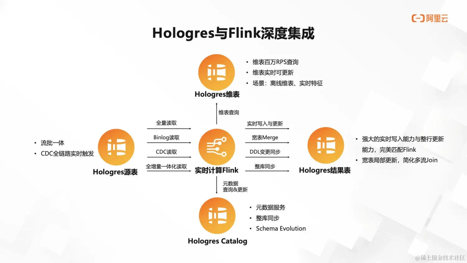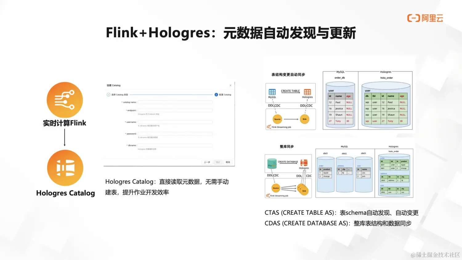 Hologres 同时也对接了 Flink 的 catalog,直接可以读取元数据,Flink 的 create table as 和 create database as 这些语法,包括 schema evolution 都可以很好的适配。