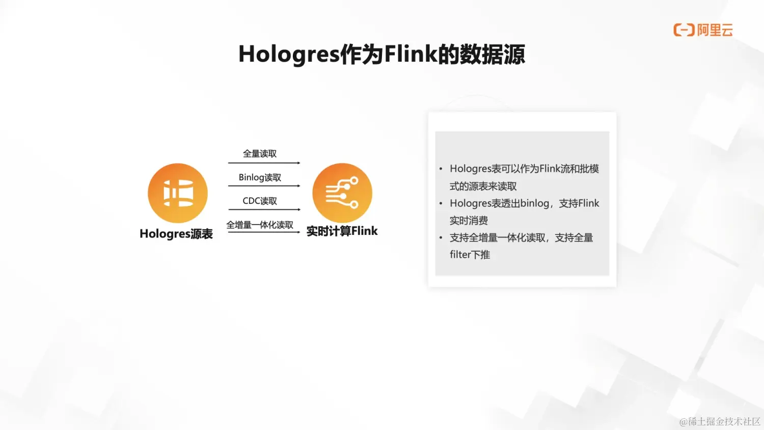 - Binlog,支持表更新事件的 Binlog 透出能力,通过 Flink 消费 Hologres Binlog,实现数仓层次间全链路实时开发,满足分层治理的前提下,缩短数据加工端到端延迟。