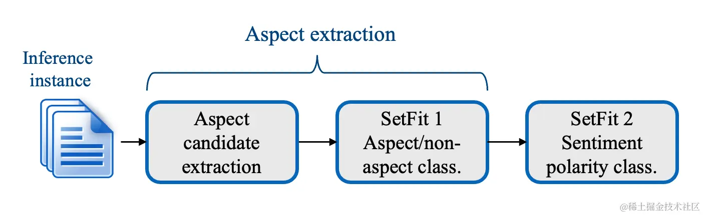 SetFitABSA 主要分三步。第一步从文本中提取候选方面; 第二步从候选方面中筛选出真正的方面,这一步主要由一个候选方面分类器来完成; 最后一步对每个方面判断其情感极性。其中,第二步和第三步均基于 SetFit 模型。