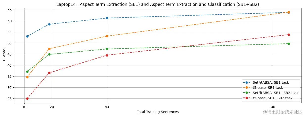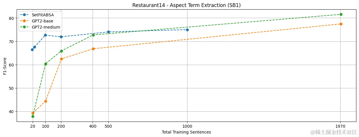 我们看到,当训练样本较少时,SetFitABSA 有明显优势,尽管它比 T5 小 2 倍,比 GPT2-medium 小 3 倍。即便是与 64 倍参数量的 Llama 2 相比,SetFitABSA 也能获得相当或更好的效果。