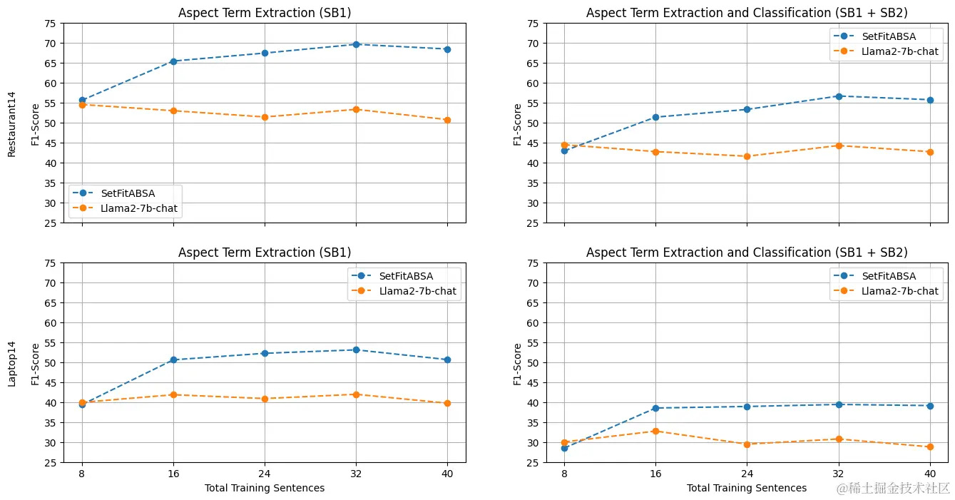 我们将 SetFitABSA 与 AWS AI 实验室 和 Salesforce AI 研究院 的最新成果进行比较,这两项工作主要采用了对 T5 和 GPT2 进行提示微调的方法以实现方面级情感分析。为了对我们的工作进行全面测评,我们还将我们的模型与基于上下文学习的 Llama-2-chat 进行了比较。