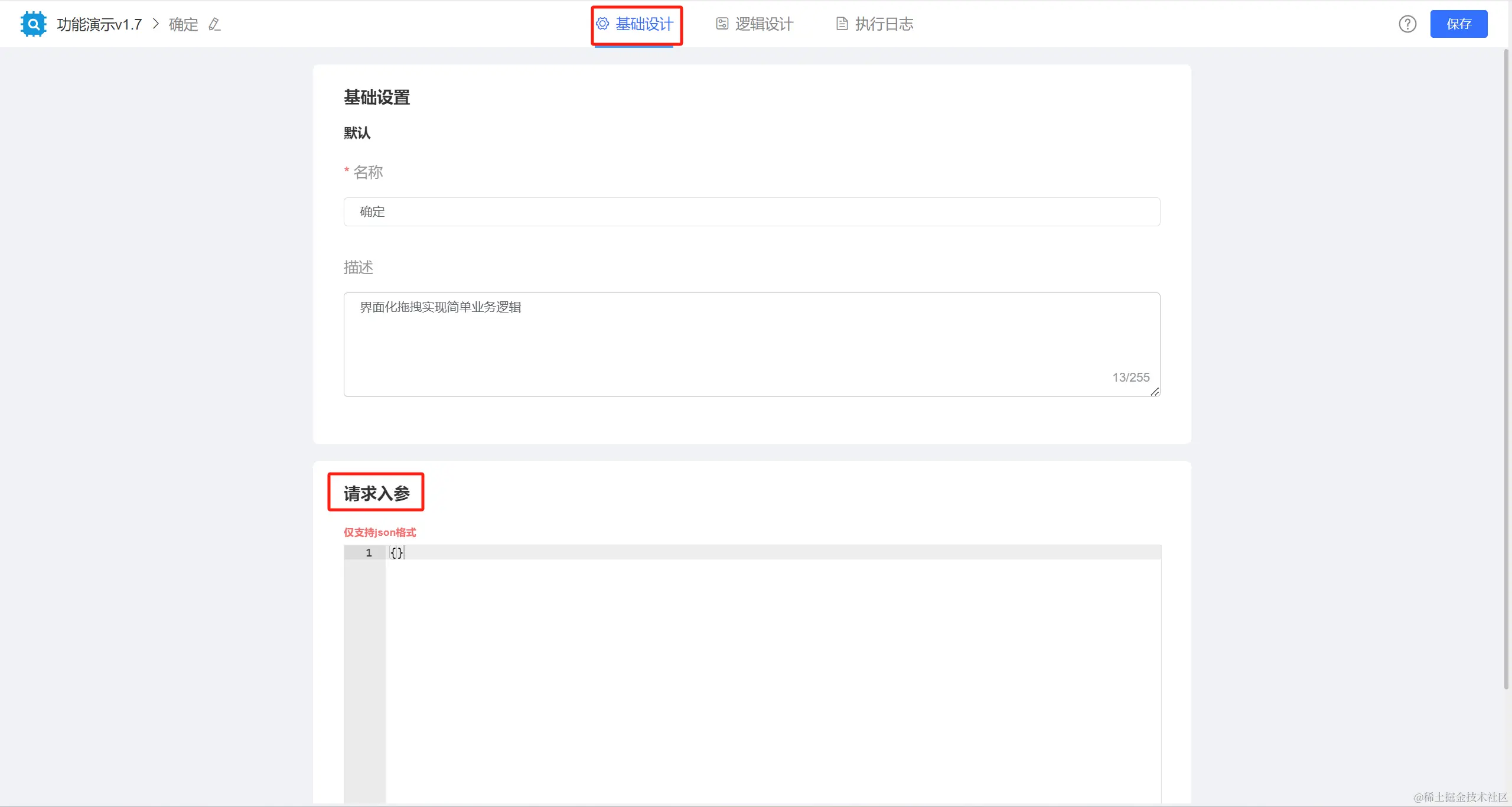 我们也可以在基础设计里填写入参,仅支持json格式。