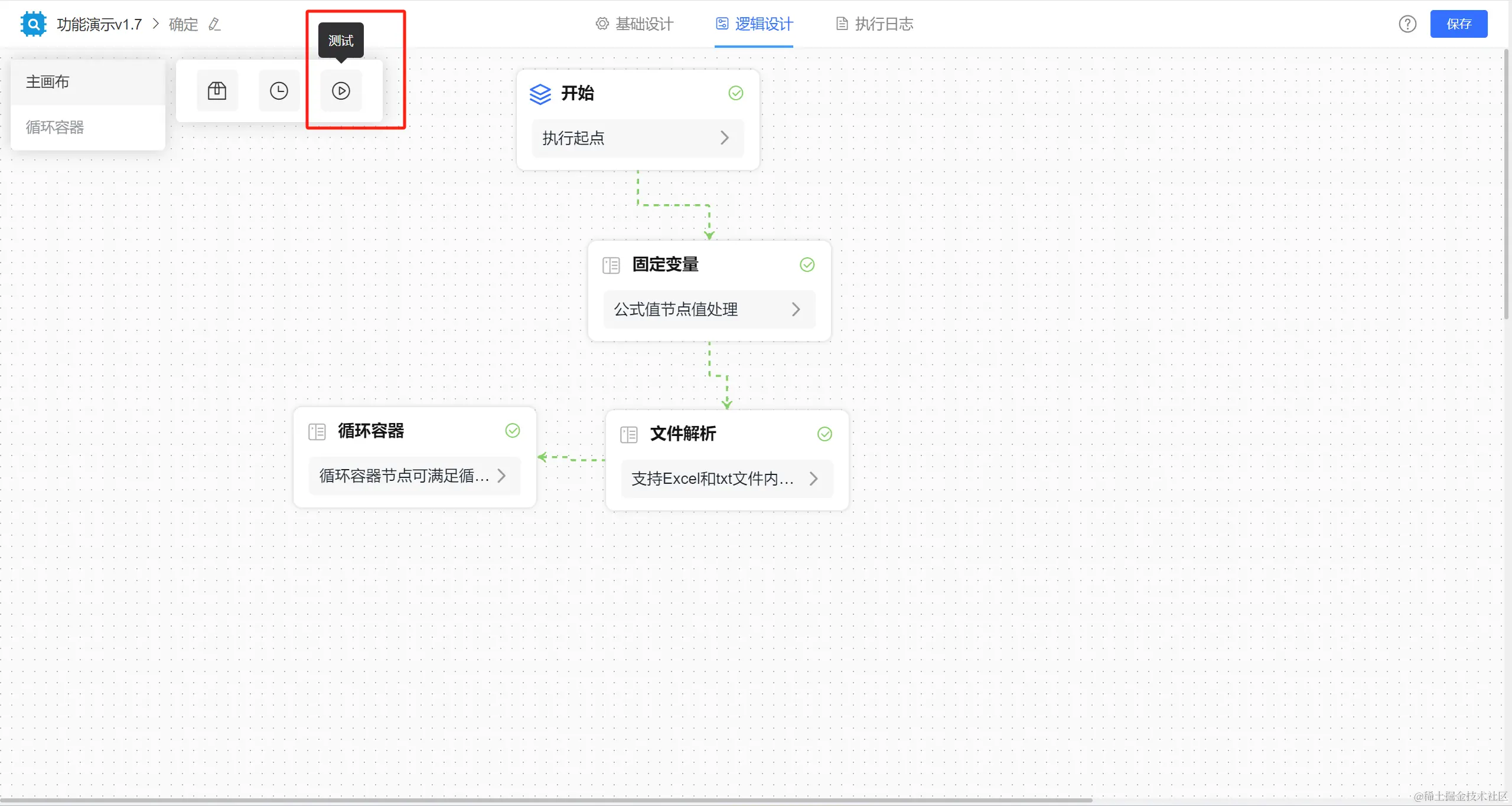 点击测试完后连线变成绿色虚线且节点上有绿色✓,光标放到节点上展示执行结果和执行入参。