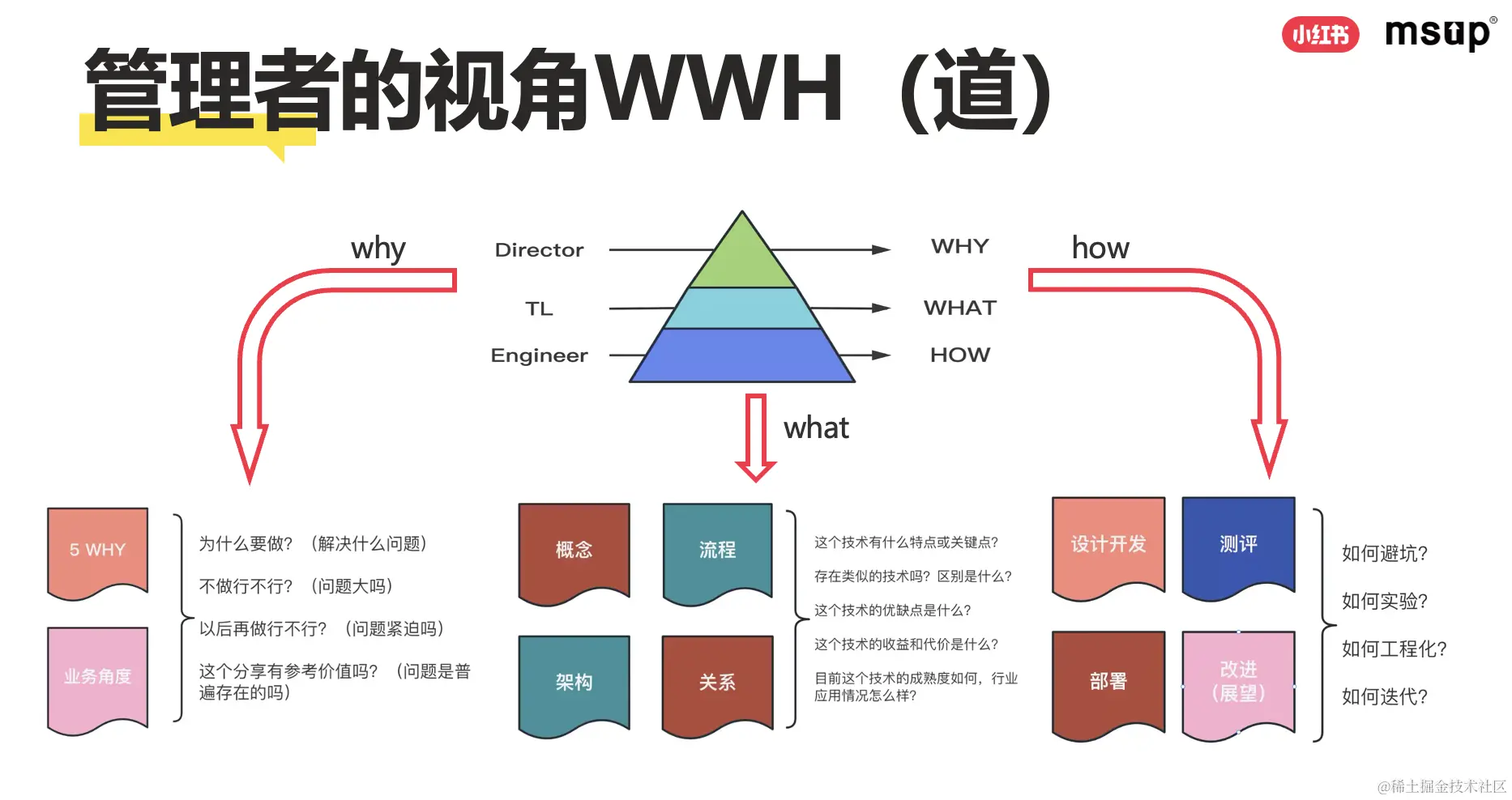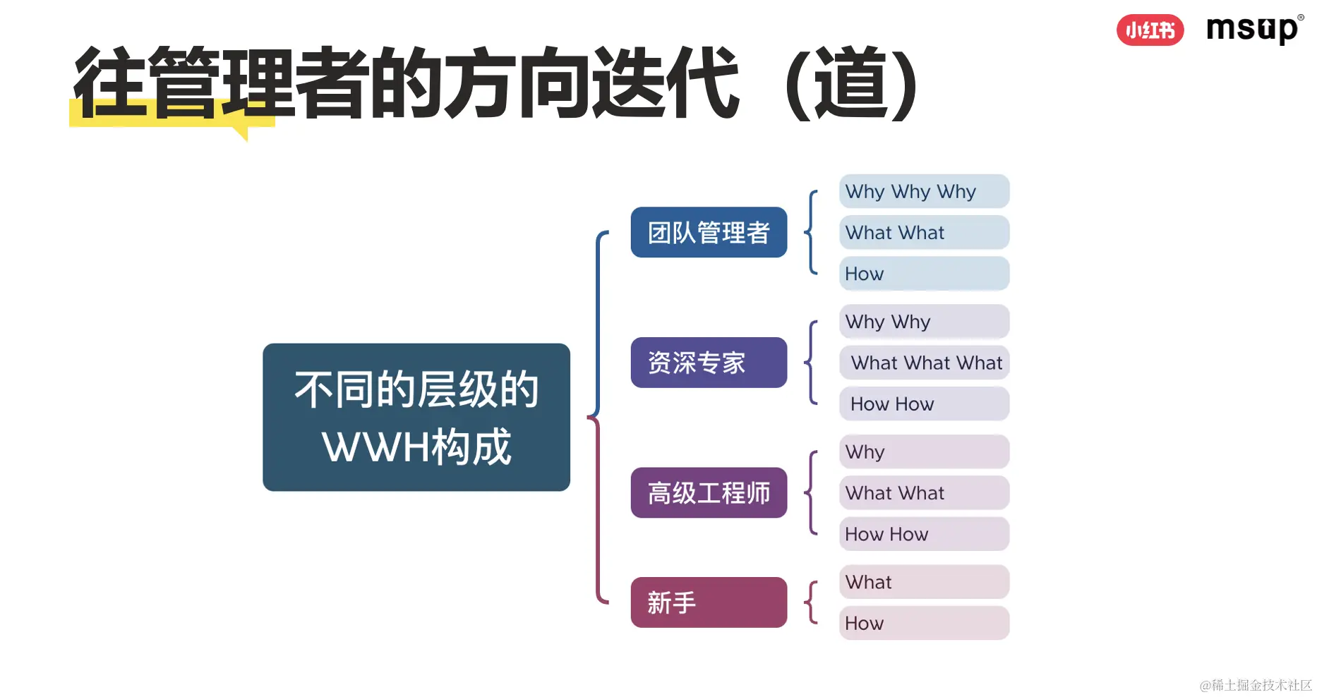 高级工程师需要深入了解技术的 what 和 how,但也不能忽视技术决策的 why;资深专家则需要在技术决策的 why 层面有更深入的理解,同时也要涉猎 what 和 how 层面的技术知识;而团队管理者则需要更多关注战略方向。