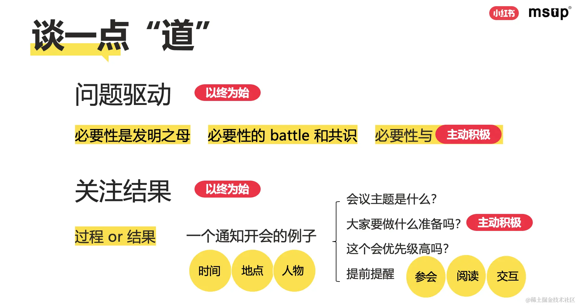 对于“道”的层面,无论是“问题驱动”还是“关注结果”,都绕不开“以终为始”。问题驱动是以终为始,因为问题的解决本身是终点;关注结果也是“以终为始”,开会一例中,大家会想为什么开会是一个过程,开会最终的目的是什么,想到这个问题就可以回到以终为始。