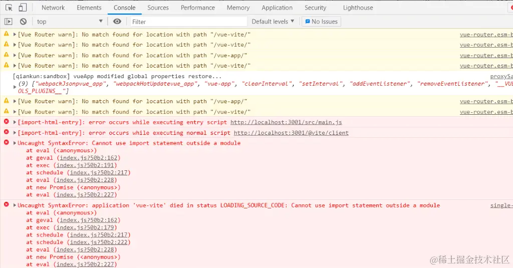 qiankun官方暂未有文档表明已经支持Vite,所以直接用普通方式接入vite构建的子应用时会出现如下问题: