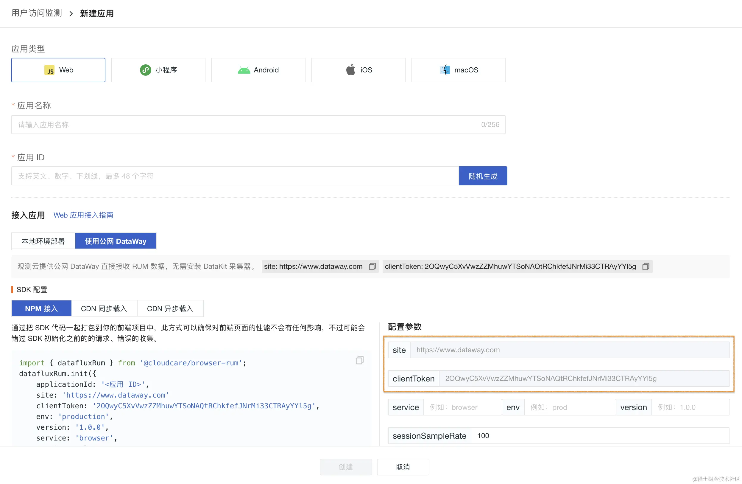 - 提供公网 DataWay直接接收 RUM 数据,无需安装 DataKit 采集器。配置