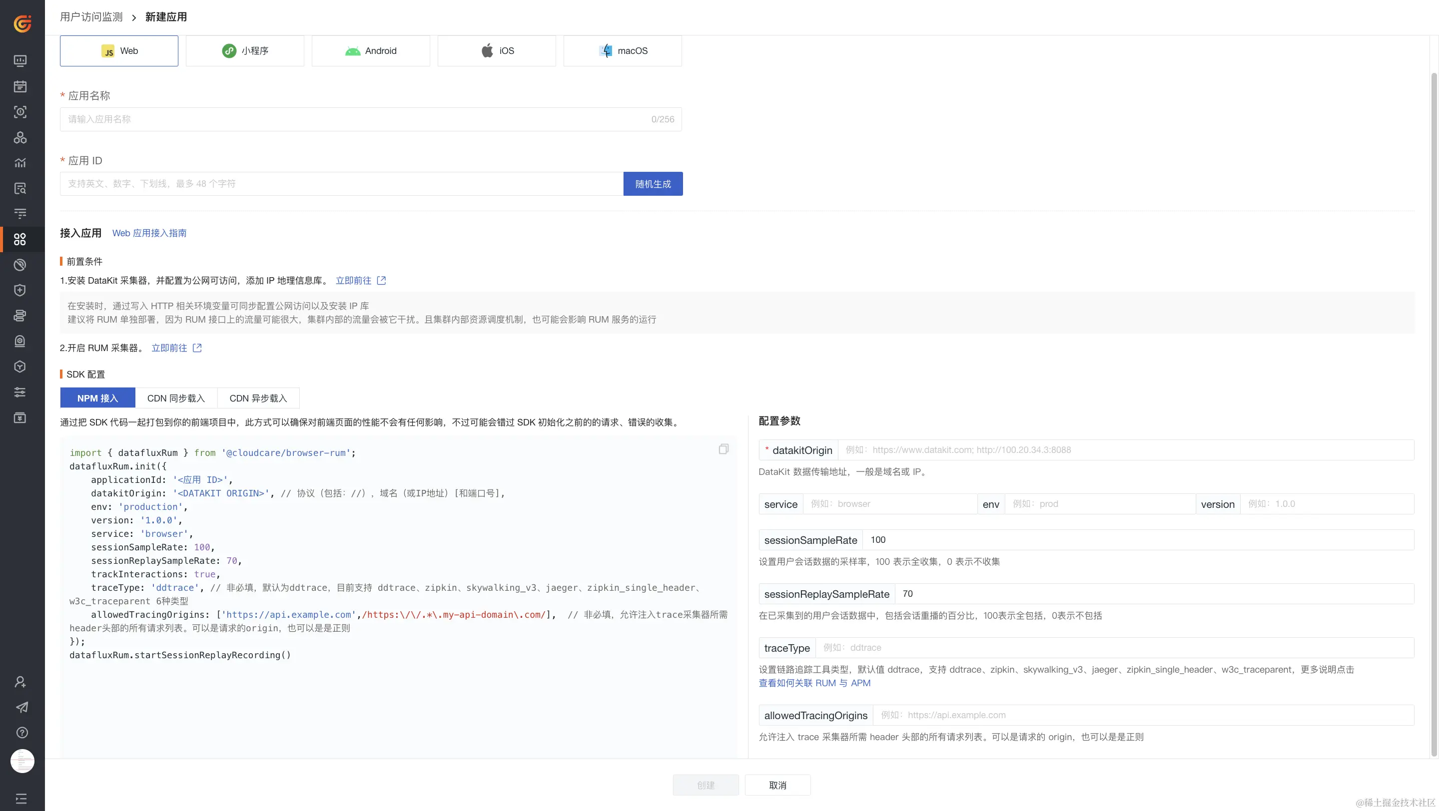 登录控制台,进入用户访问监测页面,点击左上角 [新建应用],即可开始创建一个新的应用。