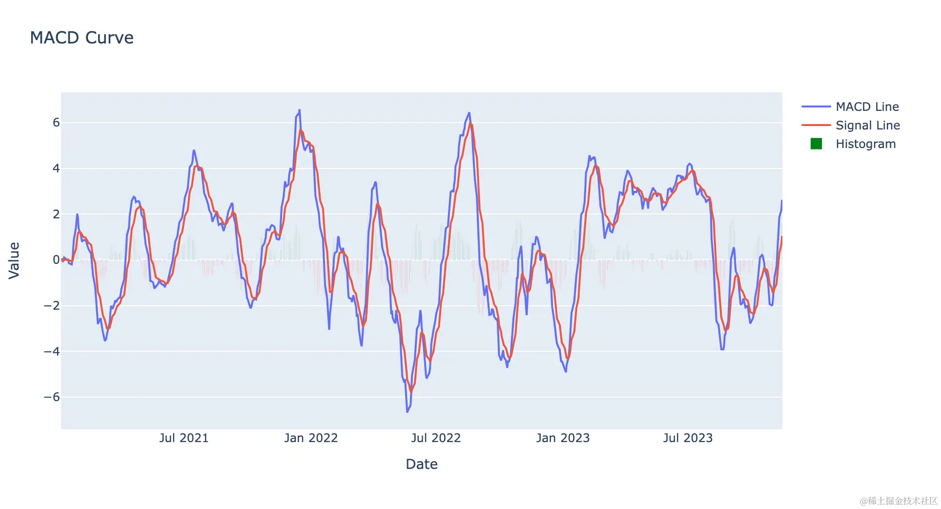 layout = go.Layout(title='MACD Curve', xaxis=dict(title='Date'), yaxis=dict(title='Value'))