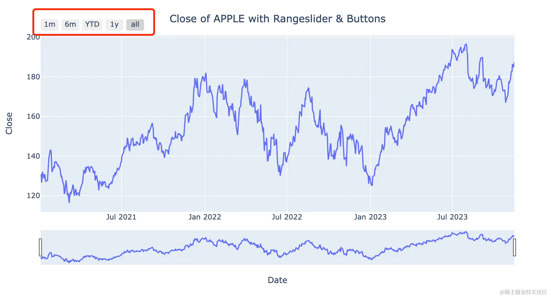 fig.update_layout(title='Close of APPLE with Rangeslider & Buttons',