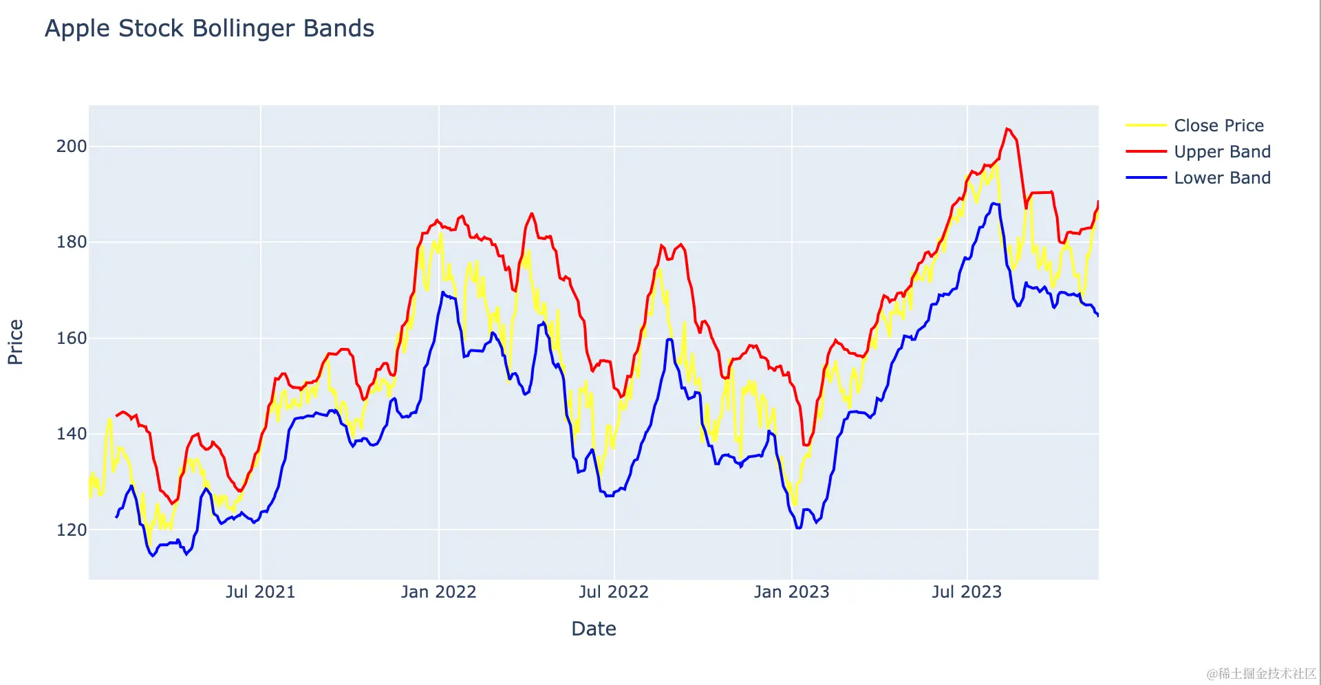 fig.update_layout(title='Apple Stock Bollinger Bands', xaxis_title='Date', yaxis_title='Price')