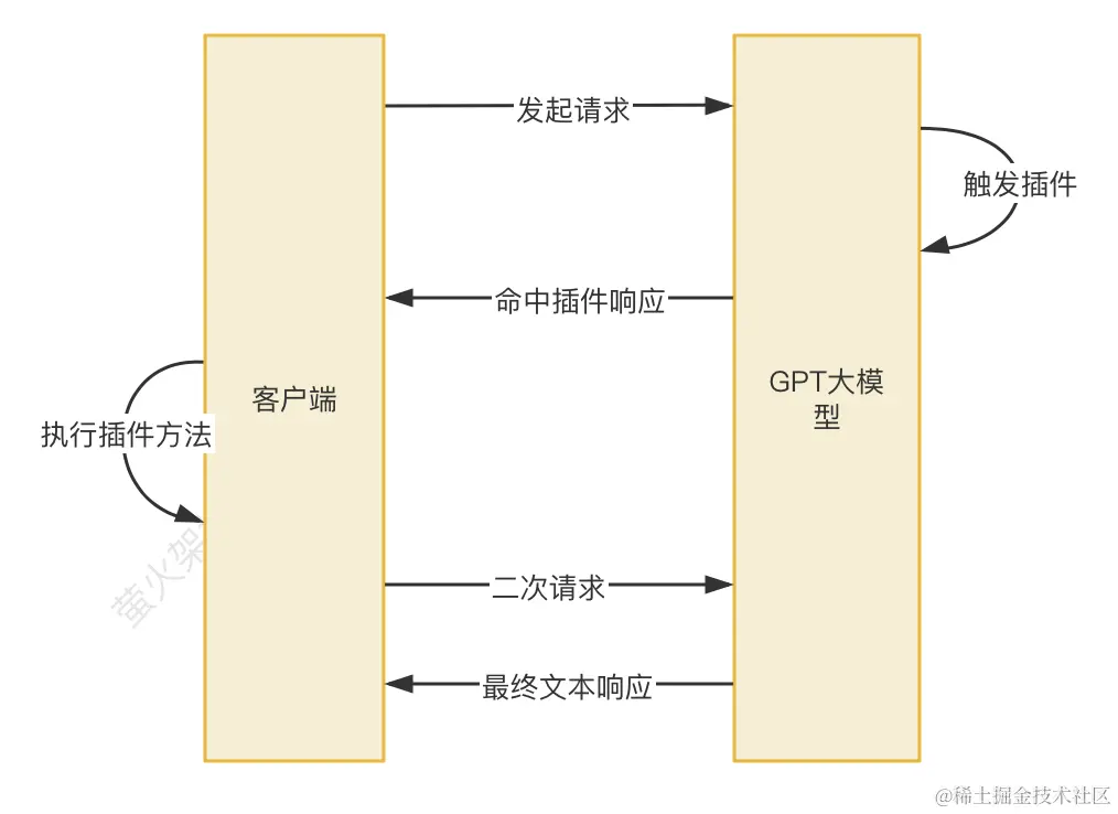 如果GPT大模型命中了插件,它会在返回值中携带一些信息。根据这些信息,我们可以知道要调用哪个插件的函数,然后再把函数的执行结果附加到消息上下文中,再请求GPT大模型,GPT大模型会使用函数返回值组织文本内容,最终返回给用户。
