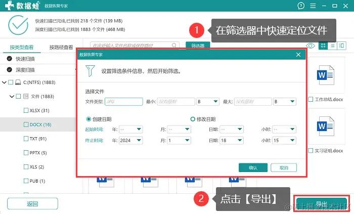 步骤3:等待深度扫描完成,用户可以借助【筛选器】 对需要恢复的数据进行快速定位,将所有需要恢复的文件都勾选上后,点击【导出】 。