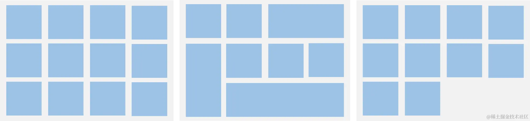 Grid组件根据行列数量与占比属性的设置,可以分为三种布局情况:
