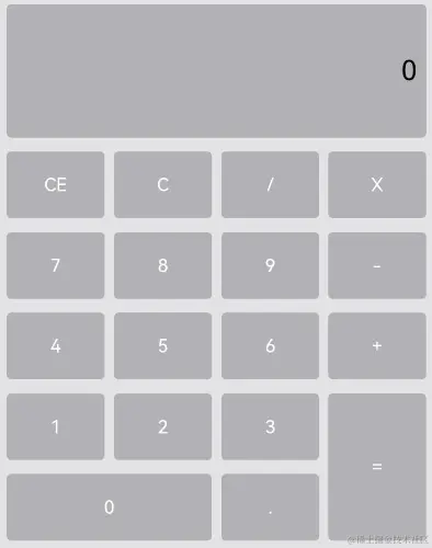 例如计算器的按键布局就是常见的不均匀网格布局场景。如下图,计算器中的按键“0”和“=”,按键“0”横跨第一、二两列,按键“=”横跨第五、六两行。使用Grid构建的网格布局,其行列标号从1开始,依次编号。