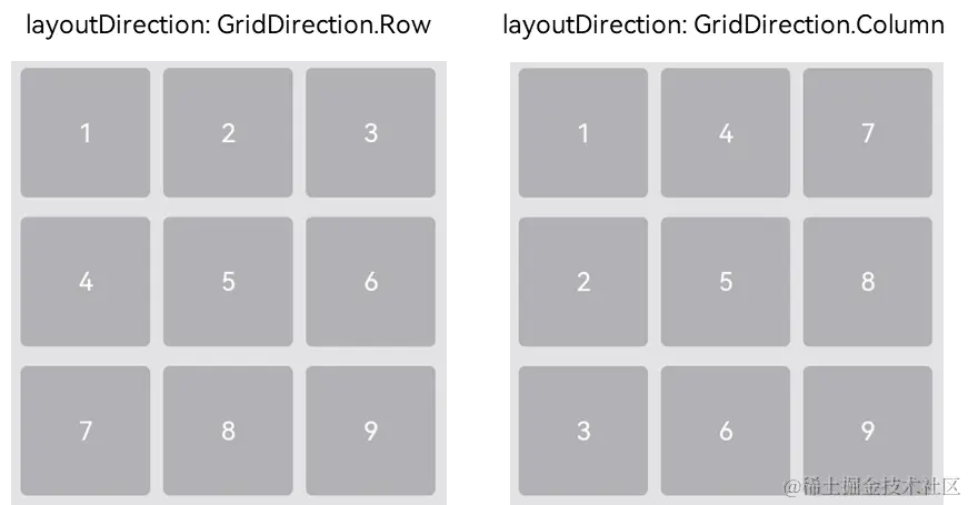 当前layoutDirection设置为Row时,先从左到右排列,排满一行再排一下一行。当前layoutDirection设置为Column时,先从上到下排列,排满一列再排一下一列,如上图所示。此时,将maxCount属性设为3,表示主轴方向上最大显示的网格单元数量为3。