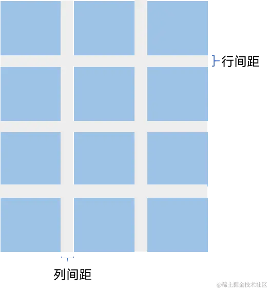 在两个网格单元之间的网格横向间距称为行间距,网格纵向间距称为列间距,如下图所示。