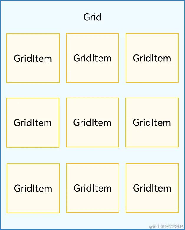 Grid组件为网格容器,其中容器内每一个条目对应一个GridItem组件,如下图所示。