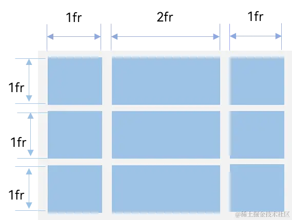 rowsTemplate和columnsTemplate属性值是一个由多个空格和'数字+fr'间隔拼接的字符串,fr的个数即网格布局的行或列数,fr前面的数值大小,用于计算该行或列在网格布局宽度上的占比,最终决定该行或列的宽度。