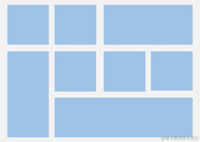 除了大小相同的等比例网格布局,由不同大小的网格组成不均匀分布的网格布局场景在实际应用中十分常见,如下图所示。在Grid组件中,通过设置GridItem的rowStart、rowEnd、columnStart和columnEnd可以实现如图所示的单个网格横跨多行或多列的场景。