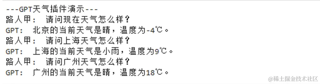 print("---GPT天气插件演示--- ")