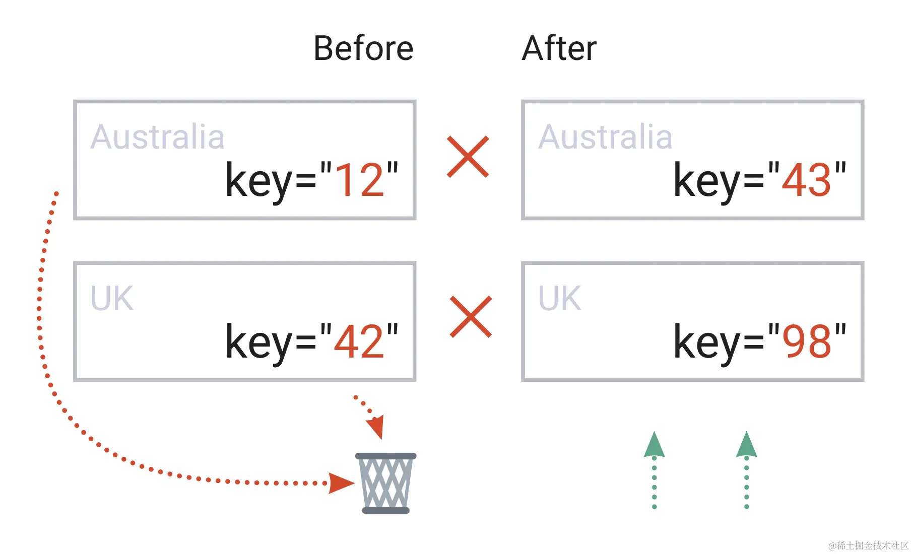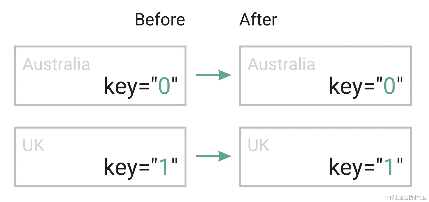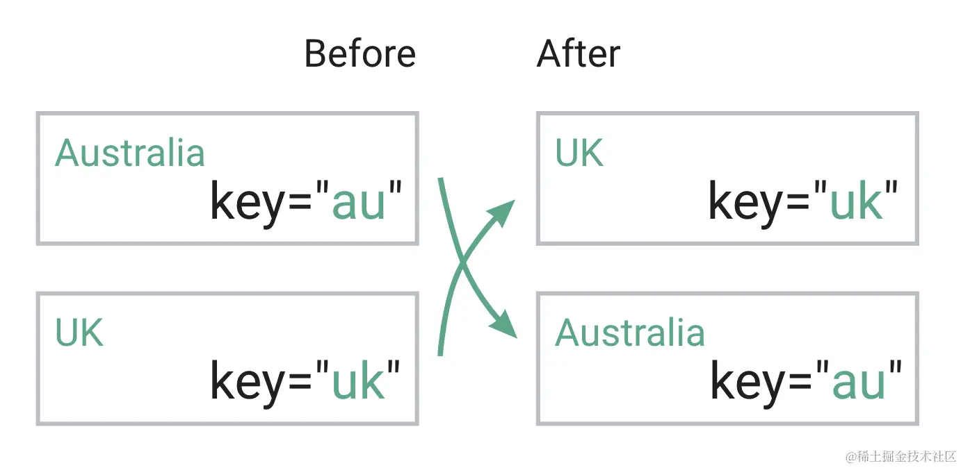 组件都没有“key”,默认使用国家数组的索引作为 key 的默认值。 - 我们的数组没有改变,因此所有项目都将被识别为之前和之后都是“已存在”,项目将被重新渲染。