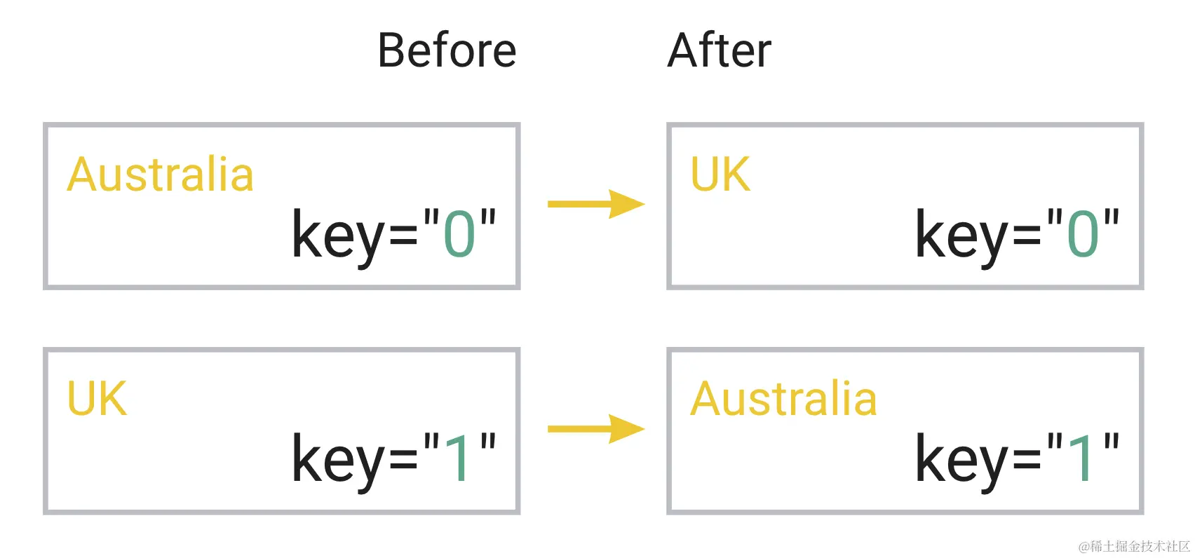的项目时,它会认为这是完全相同的项目,只是 props 值不同:在我们反转数组后,序列 0 对应的国家发生了变化。因此,它对同一个项目做了应该做的事:触发重新渲染循环。由于它发现 country