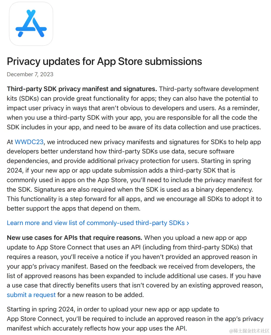 本文讨论了苹果发布的「App Store 提交隐私更新」政策以及2024年春季iOS的隐私清单,主要提出了第三方SDK隐私清单和签名以及需要提供必要理由的API流程。苹果希望通过隐私清单提升用户数据收集和使用的透明度。文章还提到了隐私清单的作用,即帮助开发者了解第三方SDK如何使用数据,并在App Store审核时提供隐私标签。那这个和标题里的 Flutter 有什么关系?因为跟随此次隐私清单升级, Apple 上线了一个对用户隐私产生重大影响的第三方 SDK 列表 ,「而在这列表恰好就有 Flutter 的存在,并且里面接近 1/3 是和 Flutter 相关的 Plugin」 ,例如 connectivity_pulus 、device_info_plus 、fluttertoast 、shared_preferences_ios 、sqflite 、webview_flutter_wkwebview 、url_launcher 等等。