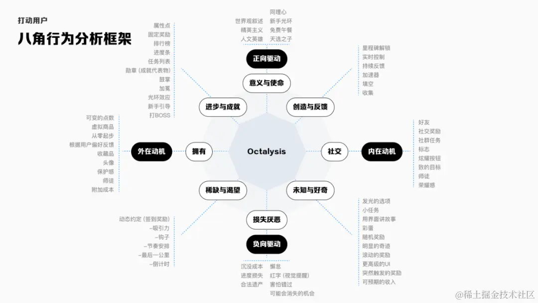 八角行为分析(Octalysis)是Yu-Kai Chou在《游戏化实战:人类行为学×游戏机制,打造产品吸引力》中提供的一个动机分析模型,该模型从八个角度分析了用户的行为动机,告诉我们出于什么样的原因用户会去做这件事。八角行为分析法可以帮助产品设计者更好地理解用户的需求和动机,从而设计出更加符合用户心理和行为习惯的产品。从用户的核心驱动力出发设计产品体验和制定策略,可以有效吸引用户并建立忠诚度,在破圈路径上就会更有机会脱颖而出。