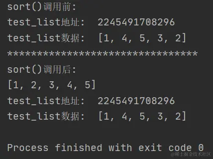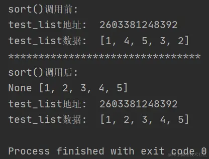 从运行结果可以看出,test_list调用sort()方法前后自身的地址并未改变,但是数据发生了变化,且sort()方法的返回值为None。