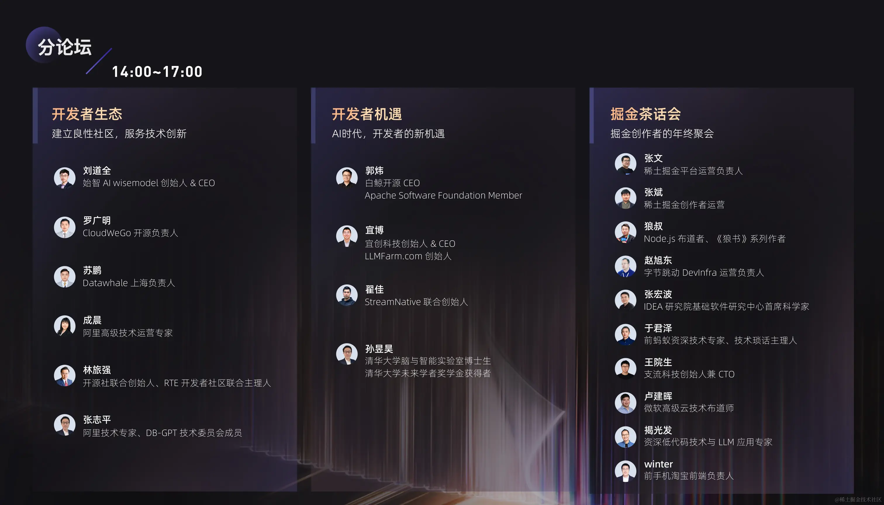 为了让各位参会者关心的技术问题有更细致、更深层次的探讨和交流,稀土掘金社区策划了3场闭门形式的分论坛。主理人及分享嘉宾见下图: